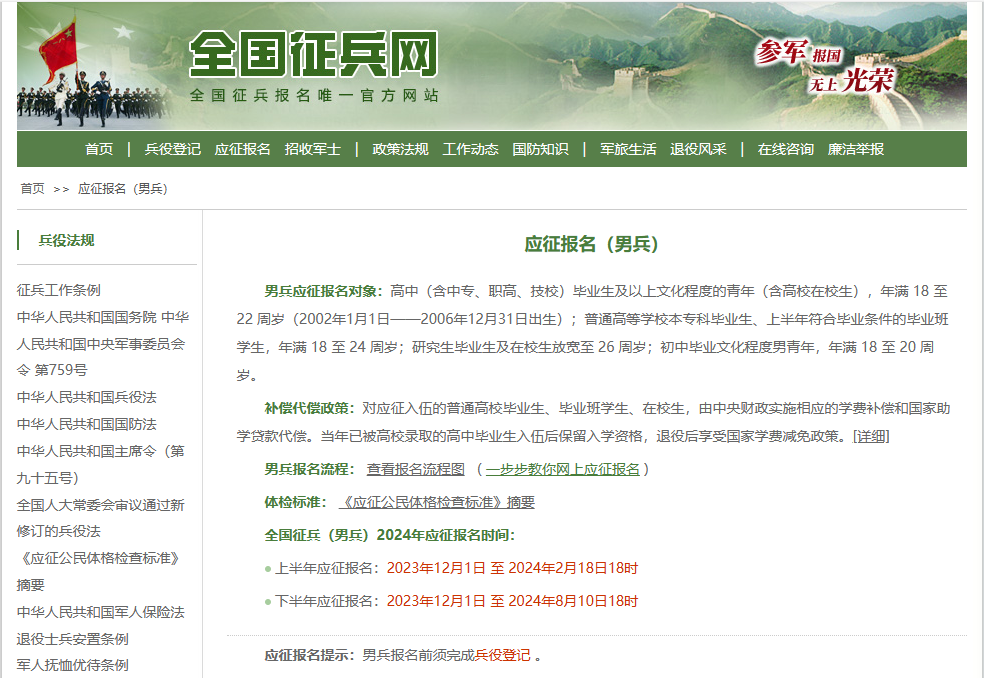 下半年应征报名:普通高中应届毕业生、普通高等学校和科研机构全日制应届毕业生及在校生,年满 18 至 22 周岁(2002年1月1日——2006年12月31日出生),全日制研究生应届毕业生及在校生放宽至 26 周岁。