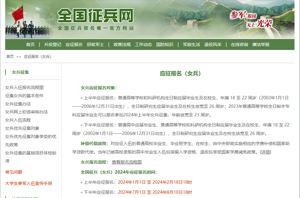 应征报名对象:上半年应征报名:普通高等学校和科研机构全日制应届毕业生及在校生,年满 18 至 22 周岁(2002年1月1日——2006年12月31日出生),全日制研究生应届毕业生及在校生放宽至 26 周岁;2023年普通高等学校全日制本专科应届毕业生可以报名参加2024年上半年女兵征集,年龄放宽至 23 周岁。