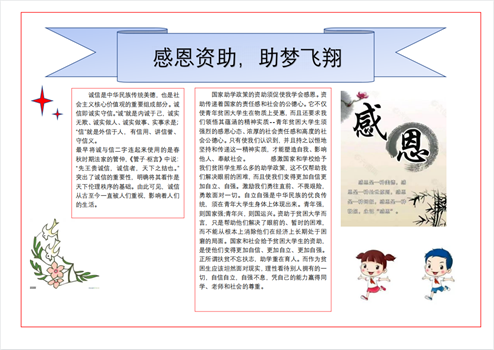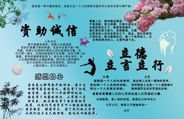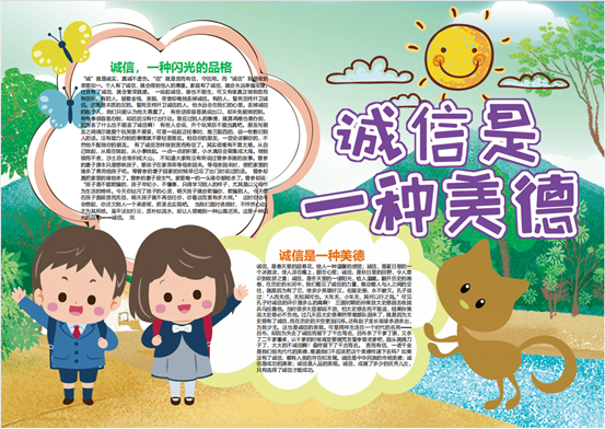 诚乃立身之本,信为道德之基。泱泱古国,悠悠华夏,在五千年中华文化的洗礼中,诚信品质永不褪色,值得我们代代人薪火相传。此次手抄报作品表现了同学们对诚信教育的认可与支持,诚信校园,诚信社会,还需大家共同参与。凝聚你我力量,秉持诚信教育,我们势在必行!