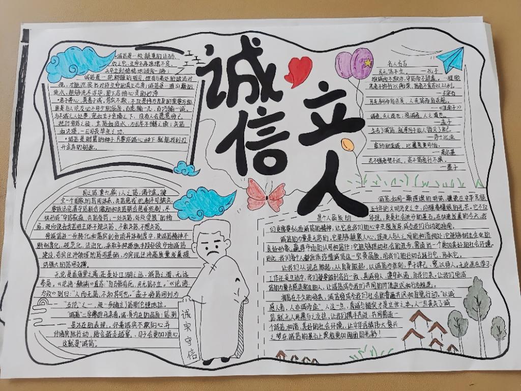 树道德之风,立诚信之本。诚实守信,既是时代的需要,也是做人的底线。本次手抄报活动开展以来,我系学子积极响应,踊跃参与,并严格按照要求遴选出以上各具特色的优秀作品。在这些作品中,同学们通过绘画、文字等形式展示了诚实守信的重要意义,在潜移默化中让同学们将诚信作为一种美德、一种修养、一种文明,追而求之,歌而颂之,共同营造“人人知诚信,人人讲诚信”的良好氛围。