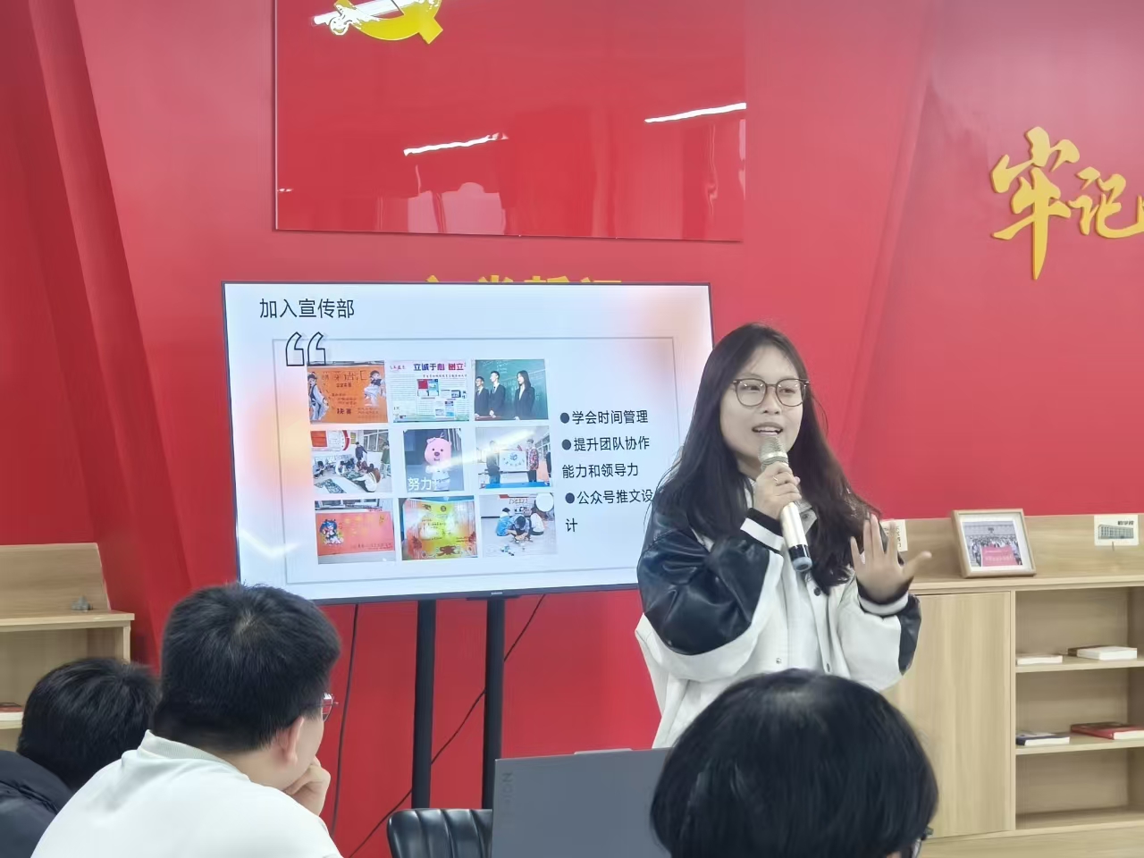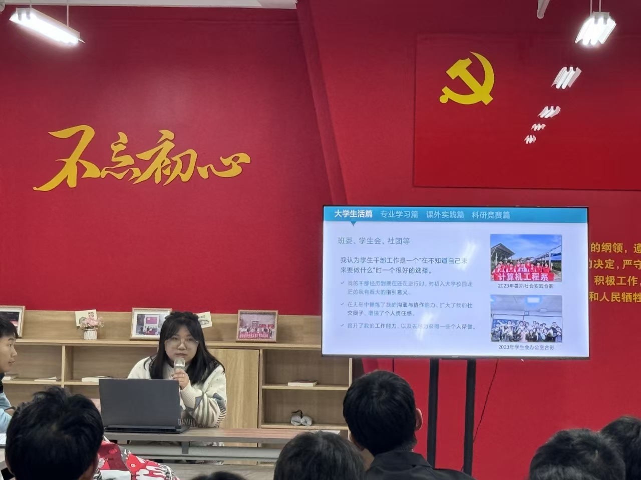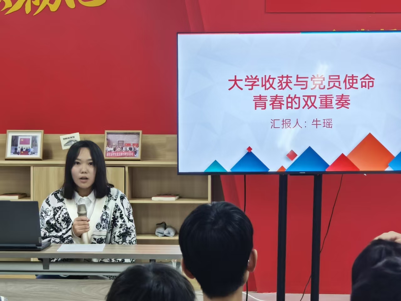 牛瑶学姐以“大学收获与党员使命:青春的双重奏”为题,主要从学习和入党方面展开分享。在学习方面,她为同学们说明了学习成绩在入团、入党、评优中的重要性,并告诫同学们不要挂科。在入党方面,她根据自己的入党经历,为大家强调了入党过程中要注意的问题。她表示入党的流程是非常漫长的,有志向入党的同学要从一开始就做好决心,为之努力。