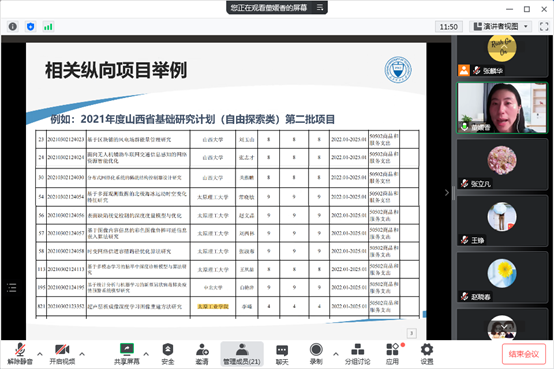 2022年11月14日,yl9193永利官网邀请太原理工大学董媛香博士做“纵向项目申请经验交流——以山西省基础研究计划为例”为题的线上学术报告,讲座采用线上方式进行,yl9193永利官网全体教师聆听了讲座。