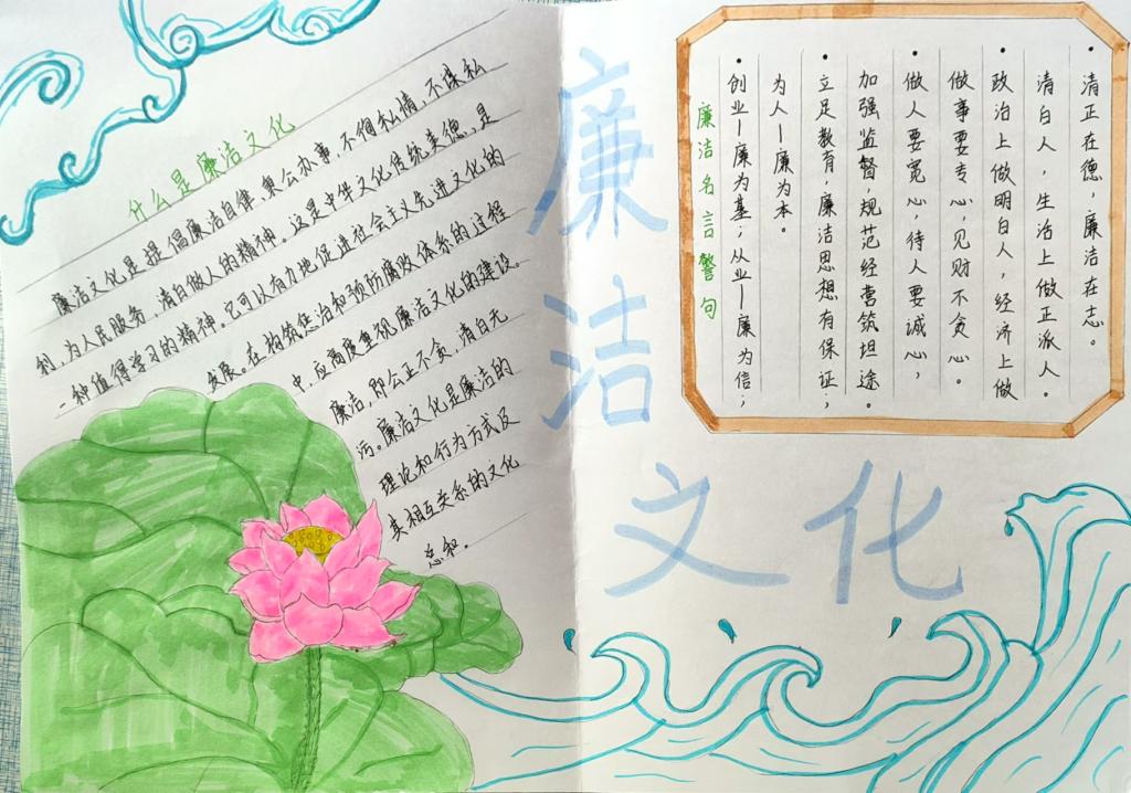 通过制作书签和手抄报的方式,加深同学们对廉洁知识的理解,同时提升了自己的动手能力,让廉洁风气盛行于校园,下面我们一起欣赏他们的成果: